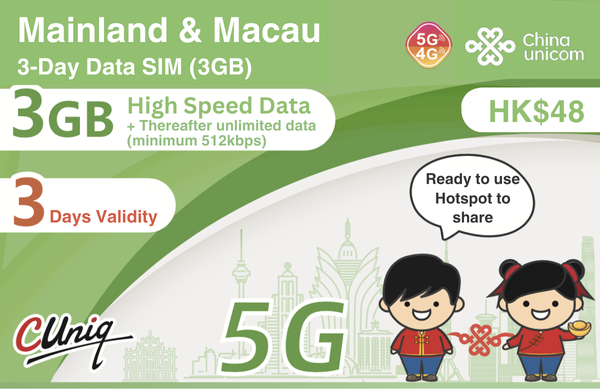 Kad Data Tanah Besar China & Macau 3 Hari (3GB)